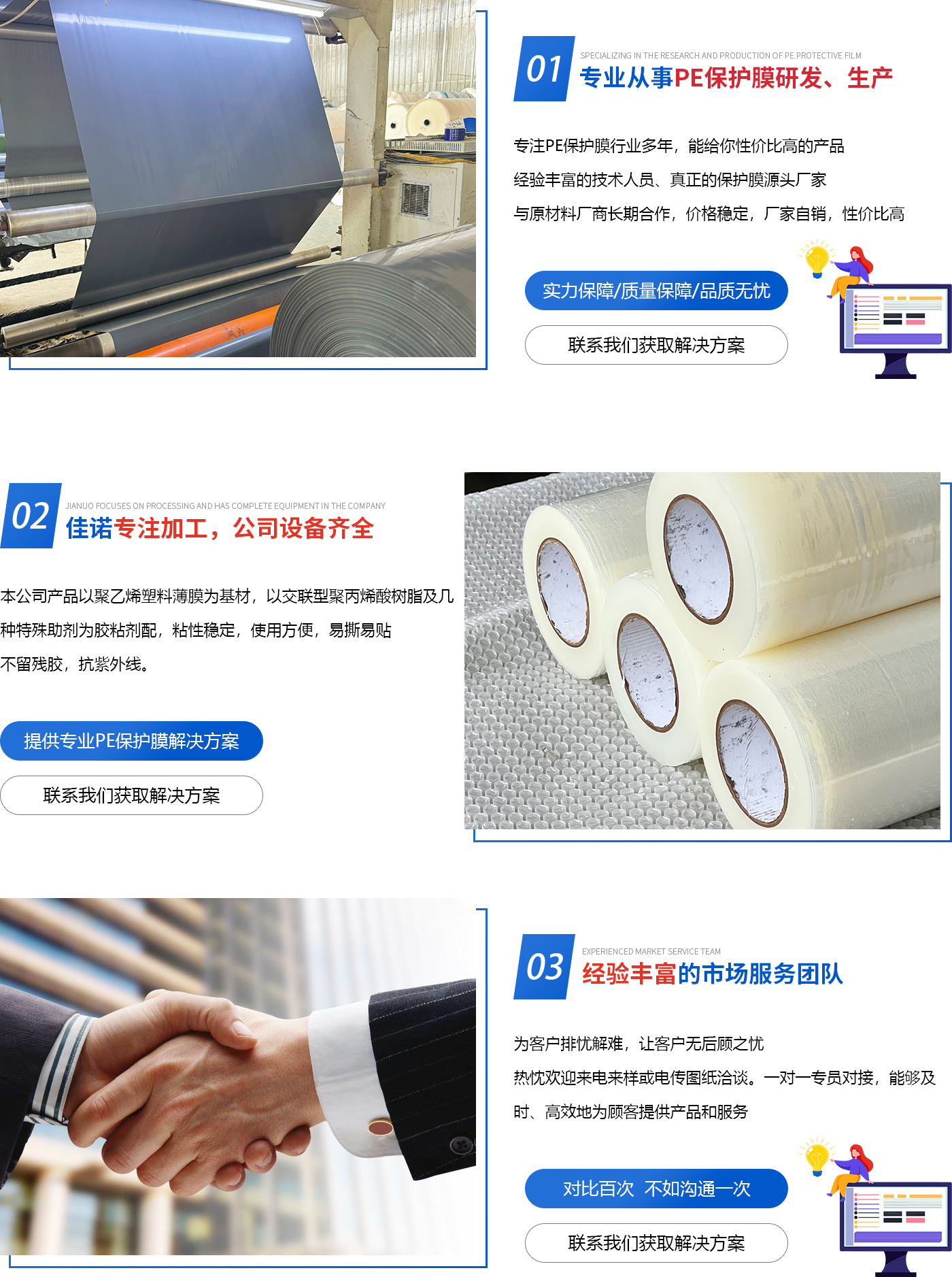 德州佳諾塑業(yè)有限公司生產(chǎn)防靜電自粘膜,包裝膜,筒子膜,原模,各種PE保護(hù)膜以及保護(hù)膜基材。公司生產(chǎn)保護(hù)膜、膠帶,是各類不銹鋼板、彩鋼板、鋁塑板、防火板、塑鋼型材、裝飾板、有機(jī)玻璃制品、漆面板、鏡面板、外墻板,保溫板,石英石,大理石,人造石,瓷磚,防盜門,木門,不銹鋼門窗,各種裝飾面板,各種建筑板材、地毯,以及電子、家用電器、家具、汽車制造,等行業(yè)不可缺少的表面保護(hù)材料。使被貼物在運(yùn)輸、加工、貯存和使用過(guò)程中不受污染、腐蝕、劃傷,保護(hù)原有的光潔亮澤的表面,從而提高產(chǎn)品質(zhì)量。 本公司產(chǎn)品用于鋁型材,PVC等材質(zhì)型材保護(hù)膜,鋁門等鋁制品保護(hù)膜,鋁塑板,不繡鋼,鋁合金等產(chǎn)品表面保護(hù)膜,保護(hù)其在運(yùn)輸途中,生產(chǎn),安裝時(shí)對(duì)產(chǎn)品表面所造成的刮傷,灰塵等。可用于,汽車門,木地板,冰箱表面等家電及電子產(chǎn)品表面的保護(hù)。 基材:PE材質(zhì) 粘性:低粘,中粘,高粘,特高粘 膜材:透明膜,藍(lán)膜,黑白膜,乳白膜 ( 除藍(lán)膜外,其...